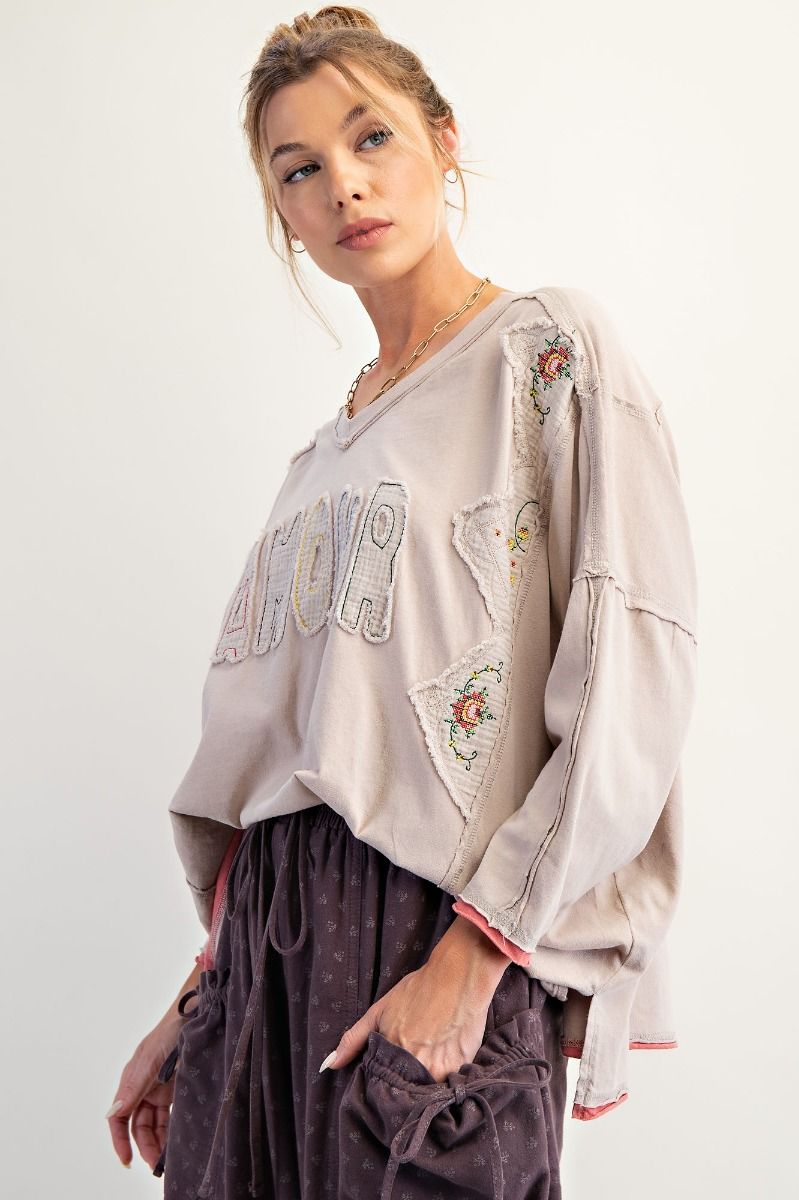 Get ready to fall in love with the Amour Patch Cotton Jersey Top! Featuring a unique mineral wash, this V-neck top is adorned with embroidered floral patches on the shoulders and sides for a touch of whimsy. Exposed seams and a raw hem add an edgy feel, while the drop shoulder and slightly cropped length keep it casual. Unleash your playful side in this must-have top!