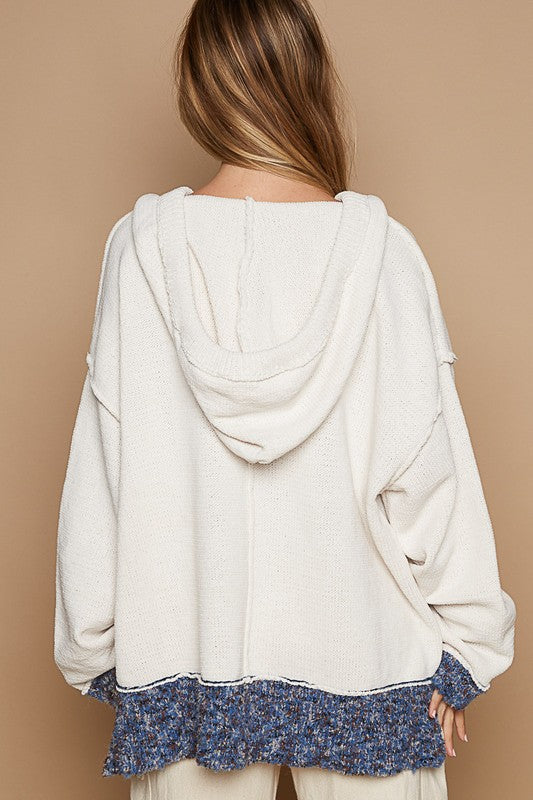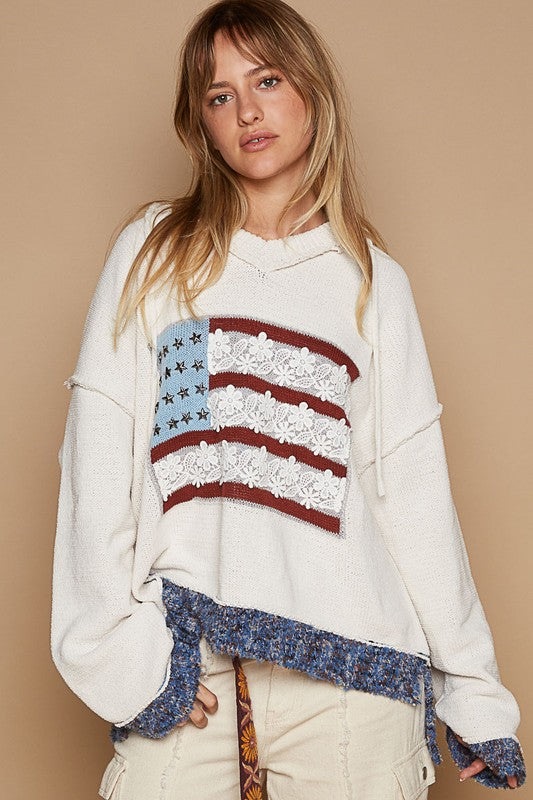 Get ready to show off your style in this Boho American Flag Sweater! This v-neck hooded top features a cozy chenille sweater fabric and a unique old glory design with star studded trim detail. It also has out seam detail and a ribbed band for the perfect fit. You'll love the stunning attention to detail on this playful and patriotic sweater.