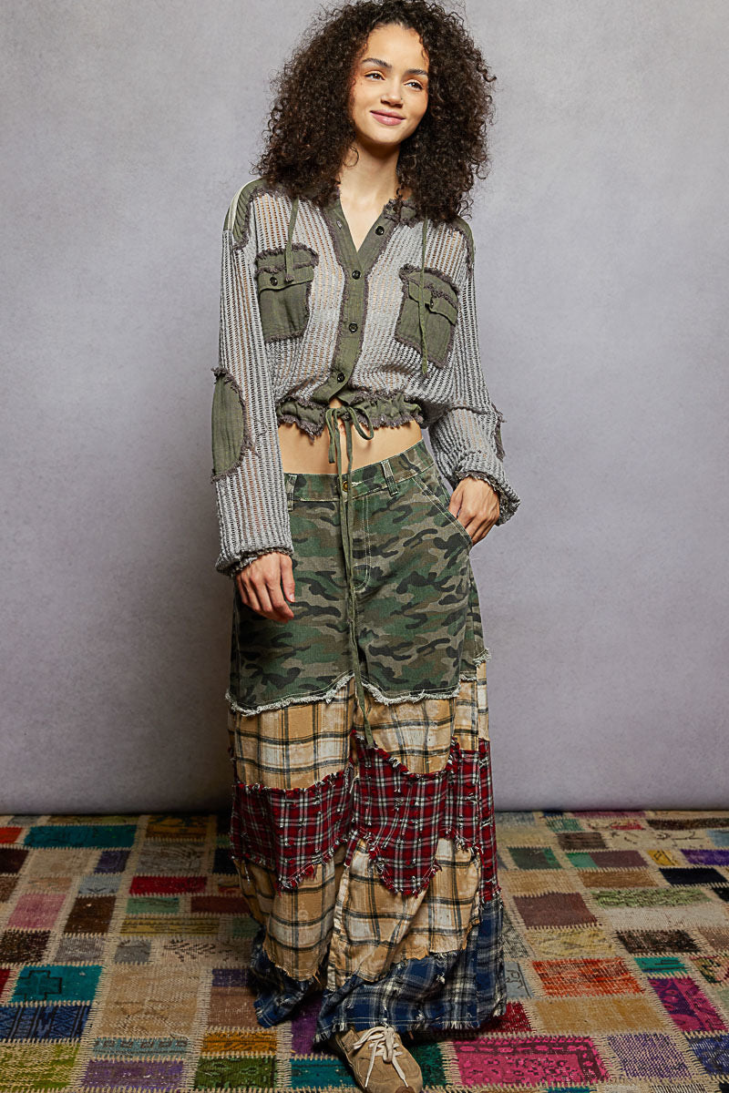 Rock an edgy vibe with this see-through button-front hoodie top that's anything but basic. Crafted from 100% cotton in a textured woven fabric, it features playful frayed edges throughout, a functional chest pocket, and cool elbow patches for extra character. The sheer design lets you layer it your way—dress it up or keep it casual. Pair it with the matching bottoms for a coordinated look that screams effortless cool.