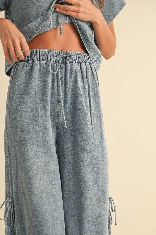 Say goodbye to boring pants with these Denim Tie Pants! The drawstring waist and side tie details add some playful flair to the straight leg silhouette. Make a statement and stay comfortable all day long.