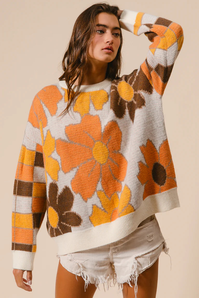 Add a pop of color and pattern to your wardrobe with our Floral Mix Top. Featuring a beautiful mix of floral and gingham prints, this sweater top is perfect for adding a touch of personality to any outfit. Stay warm and stylish with this unique and eye-catching piece!