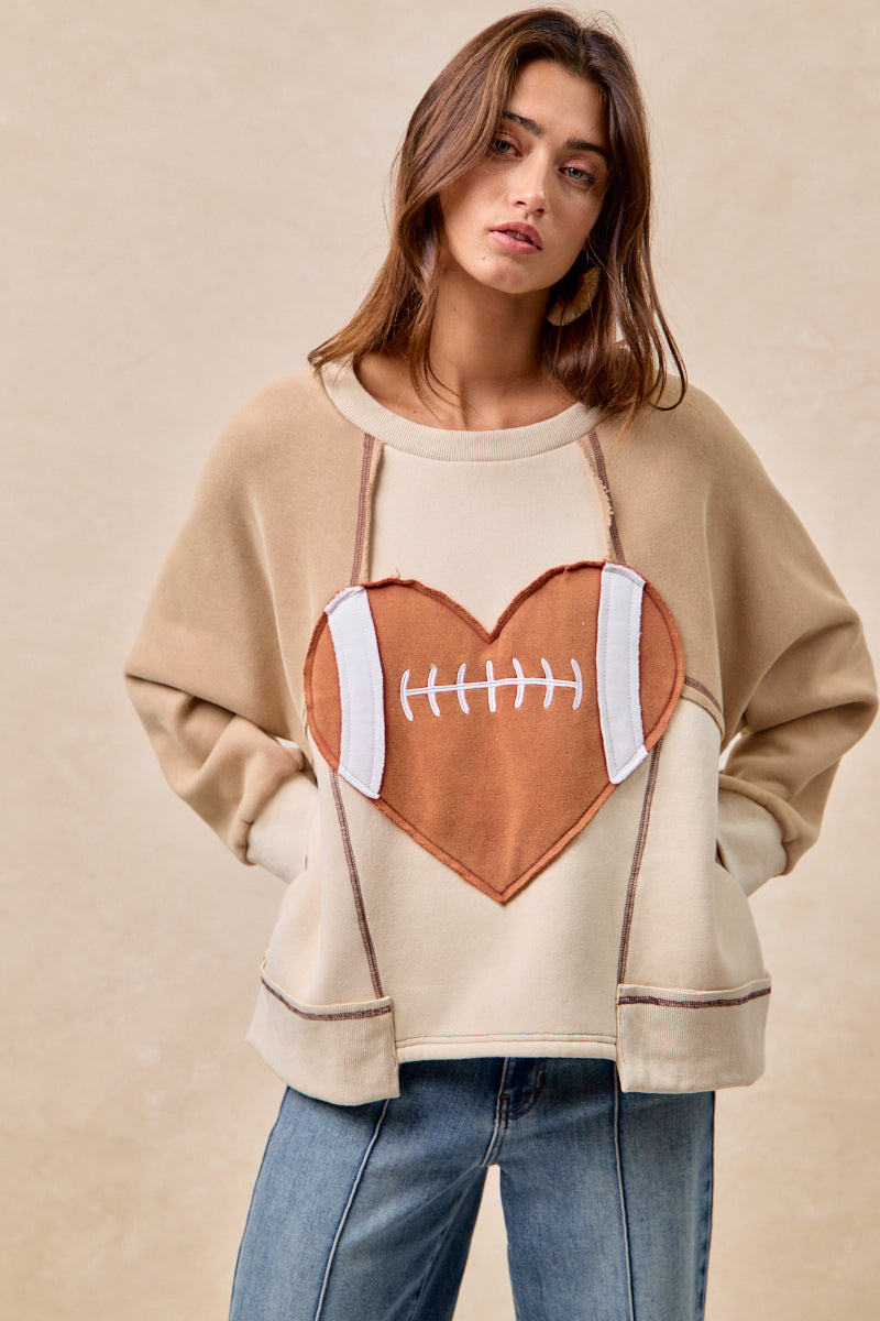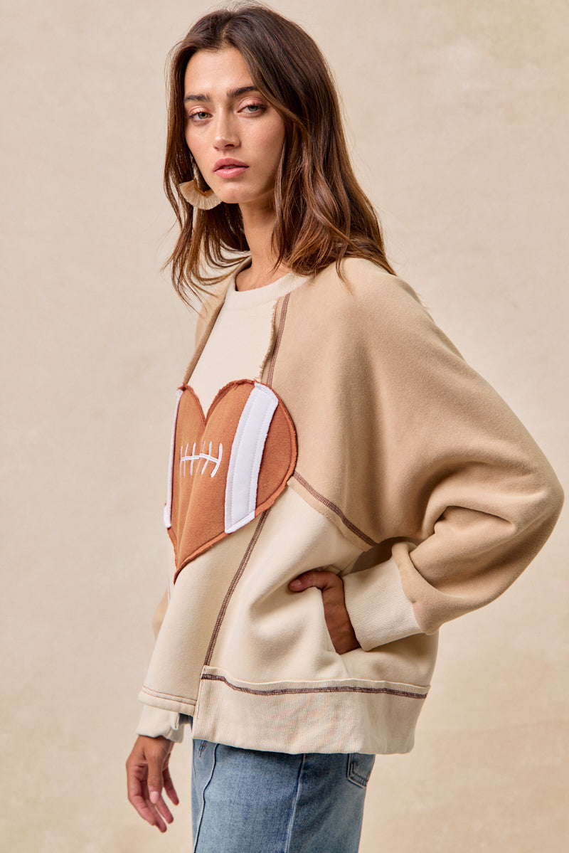 Stay warm and spirited with the Gameday Heart Crew fleece sweatshirt, featuring a unique football patchwork design and convenient side pockets. This cozy sweatshirt combines comfort and style, making it your go-to choice for game day or everyday wear. Embrace fan pride while enjoying practical warmth and easy storage.