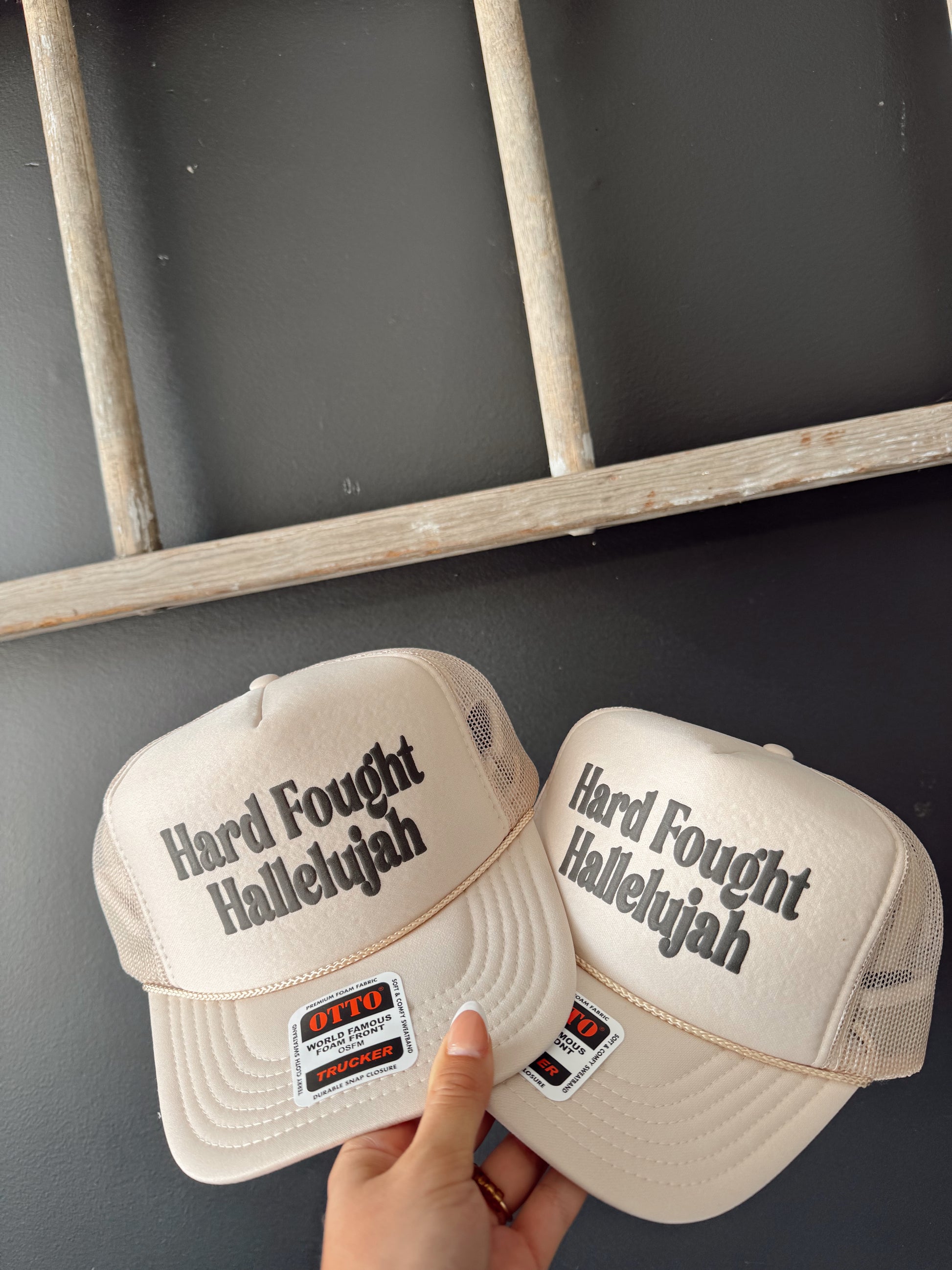 Get ready to fight the good fight with the Hard Fought Hallelujah Hat. This trucker hat is as tough as they come, with a stylish twist. You'll be saying "hallelujah" all day long as you conquer the day in style. (Goes great with your never-ending supply of courage.)