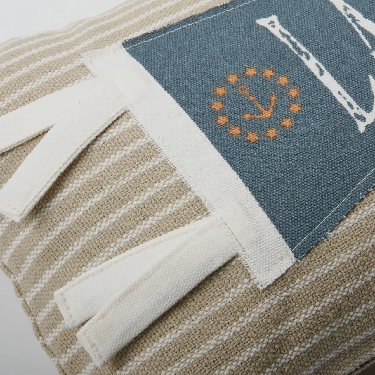 Add a touch of quirky charm to your lake house with our Lake Life pennant throw pillow. Made of soft woven cotton in cream and tan stripes, this pillow features a canvas pennant stitched on the front. Perfect for cozying up on the couch or adding a playful accent to your decor.