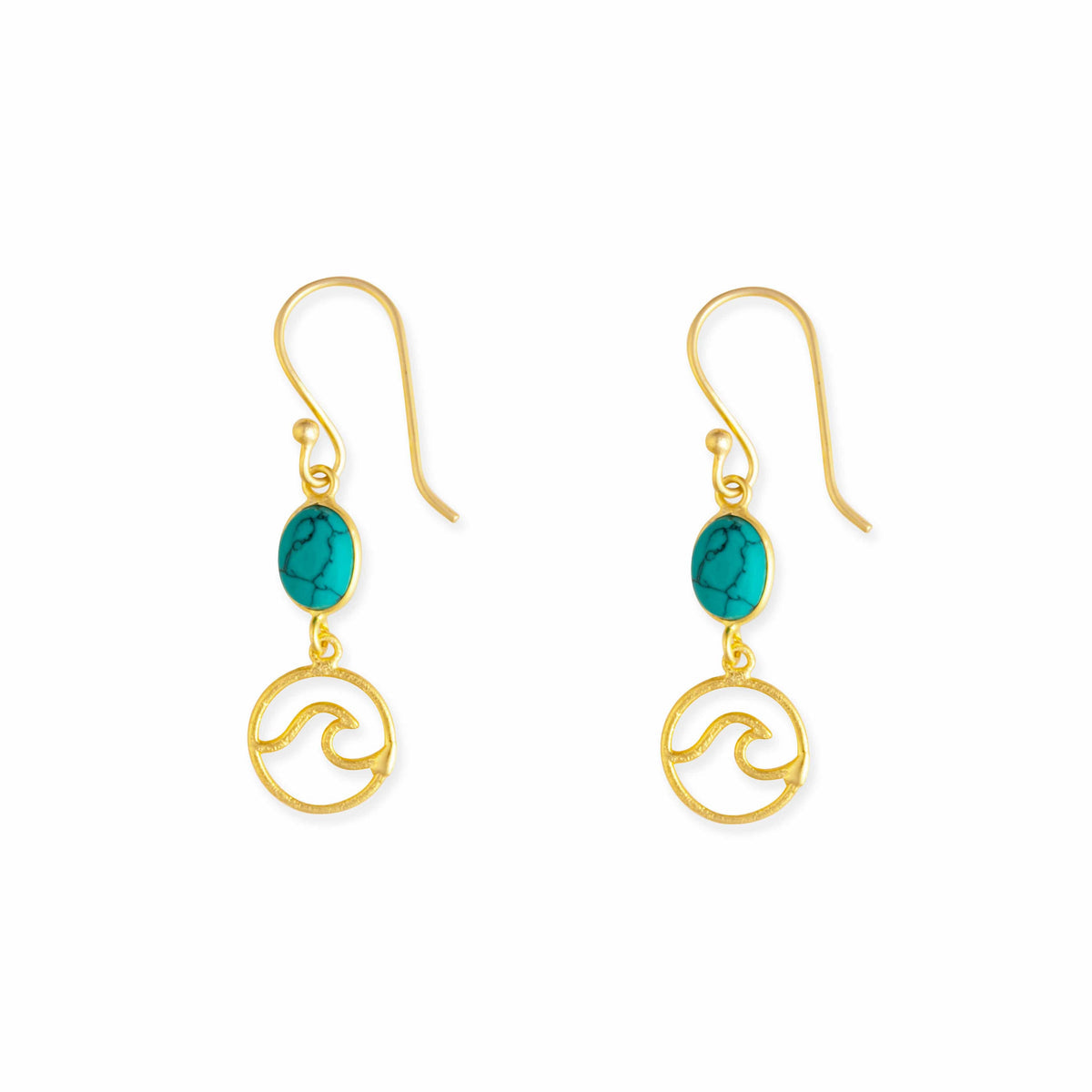 Add a touch of ocean-inspired charm to any outfit with these Morning Surf Earrings. Featuring beautiful ocean blue cabochons and wave-inspired charms, these earrings are perfect for beach lovers and anyone in need of a little tropical vibe. Made with synthetic turquoise stone and brass metal, these earrings measure 1.75 inches in height and are the perfect accessory for those vacation days or beach trips.