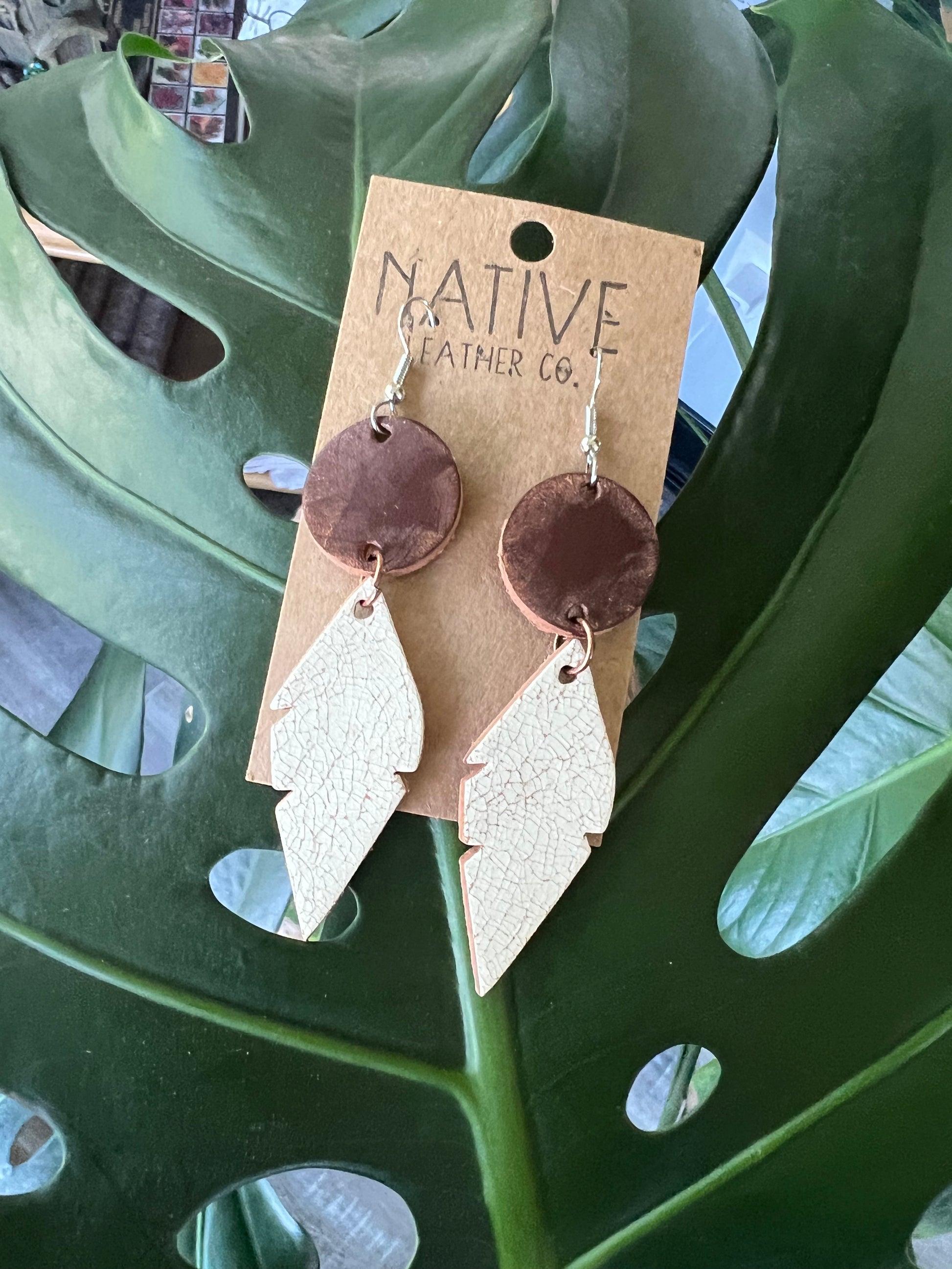 Add some playful and bohemian flair to your style with our Native Leather Earrings! Made with lightweight brown leather circles and a cream cracked leather feather, these edgy earrings are the perfect addition to any outfit. The neutral colors make them versatile and fun to wear.