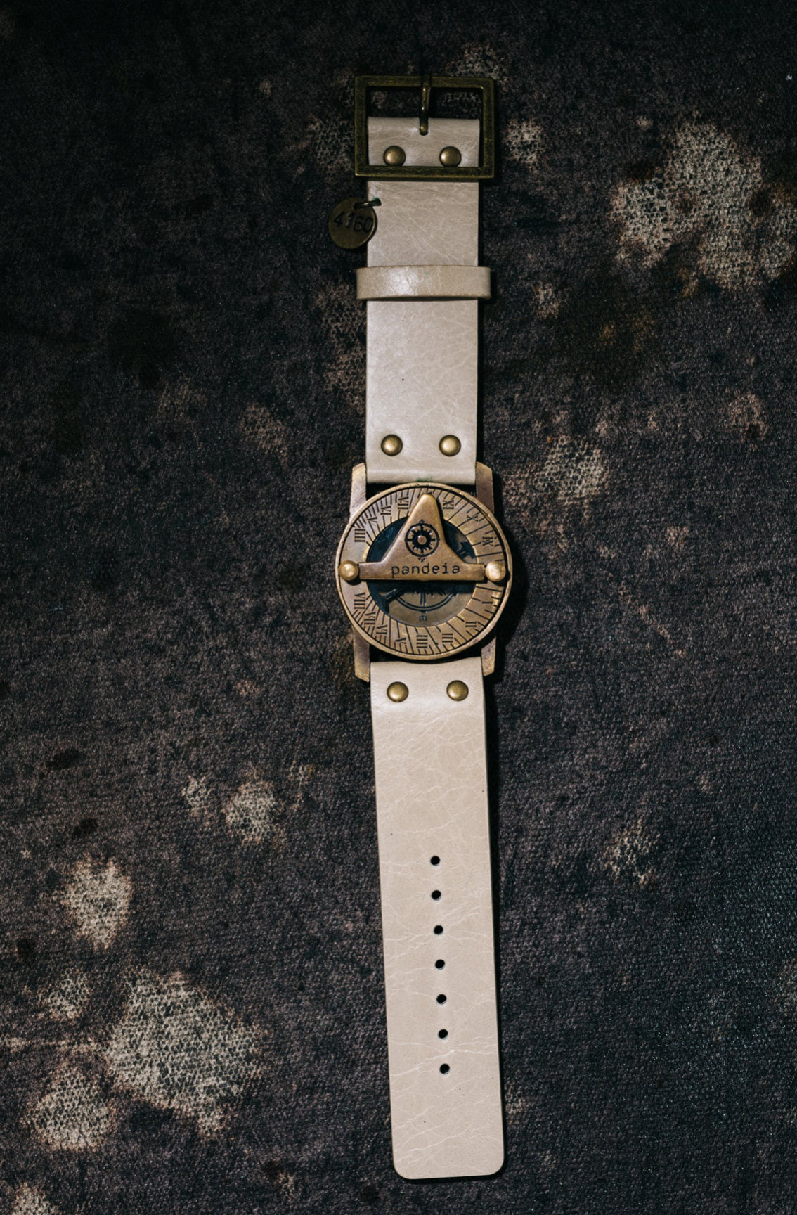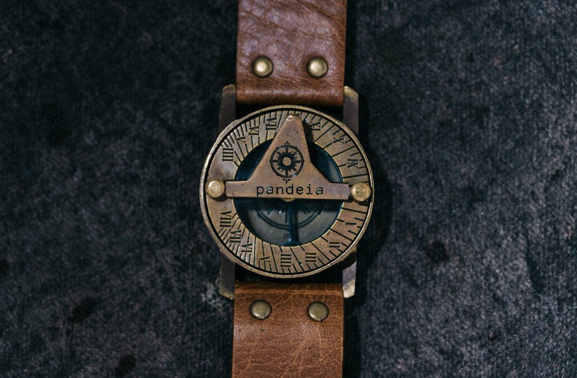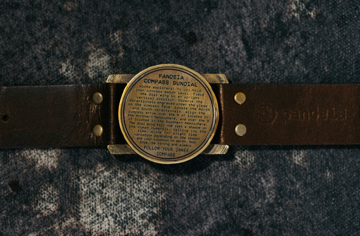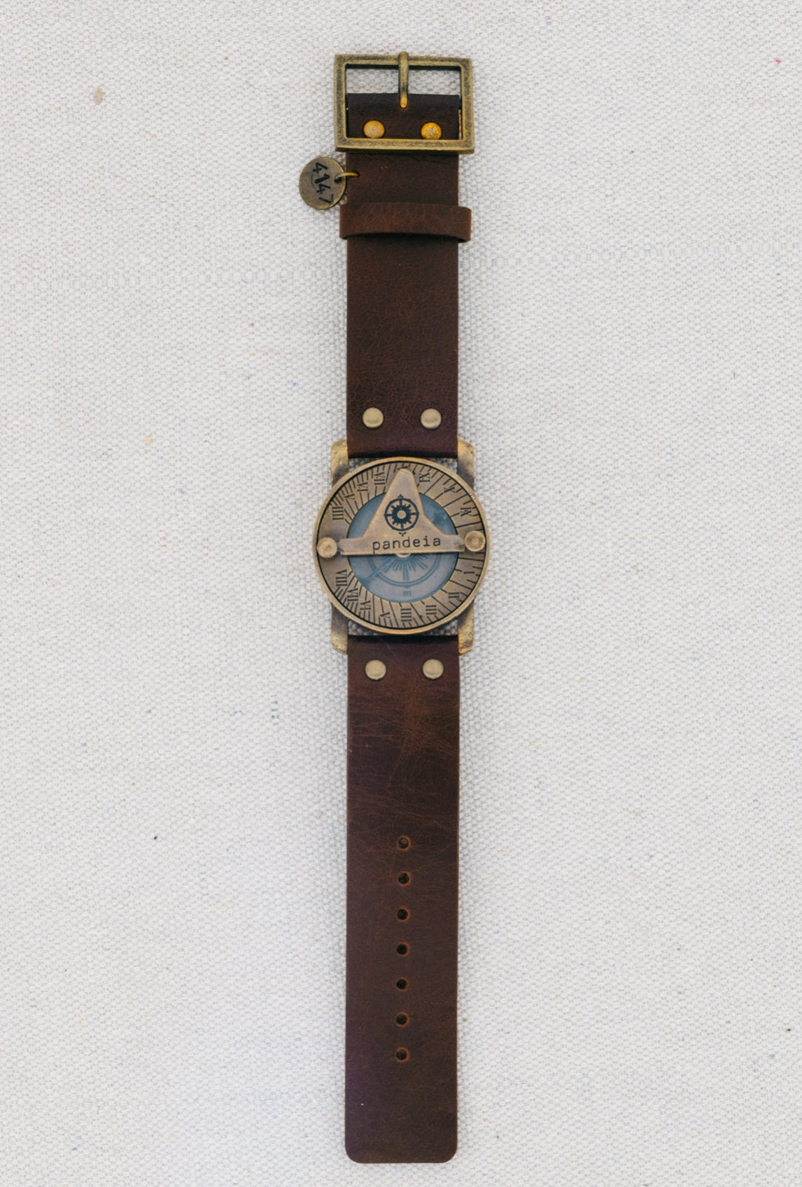 Pandeia compass sundial watches were created to adorn the wrists of the wild ones. This unique time piece uses the forces of nature surrounding us to tell the time. They were inspired by ancient methods of horology and are crafted to perfection on the island of Maui. Composed of antiqued brass, glass and leather, each watch is as unique as its curious owner. Every watch is individually numbered for authenticity, marked by a hand-stamped coin. Instructions for use are engraved on the back. Pandeia compass sundial watches serve as a wearable reminder to escape the boundaries of time and to always follow your inner compass.