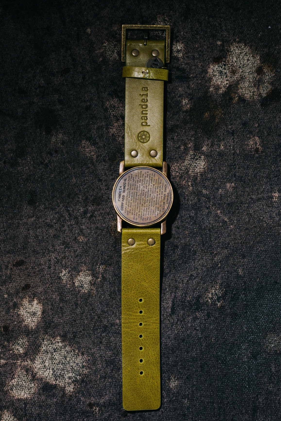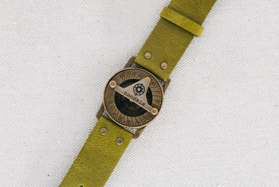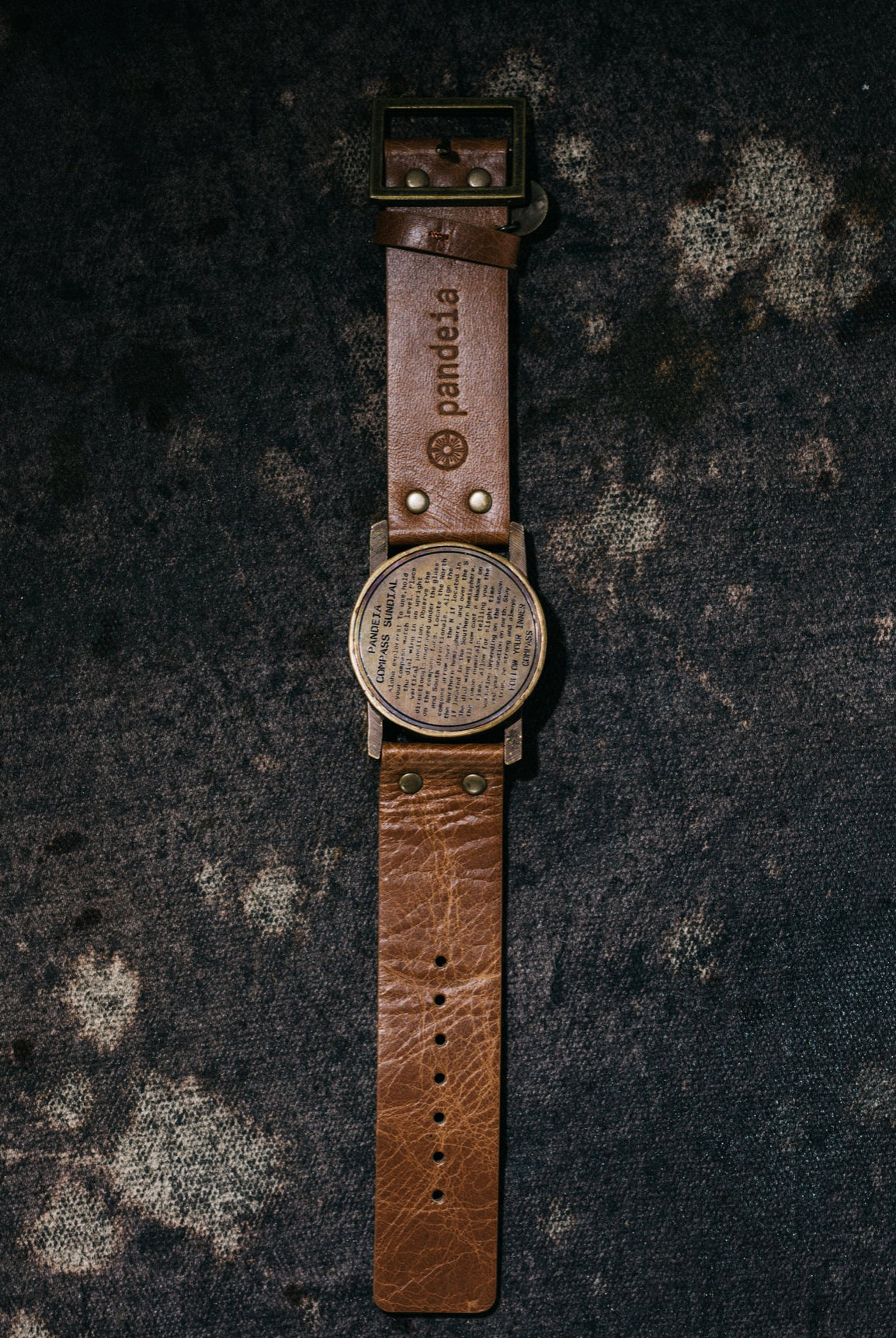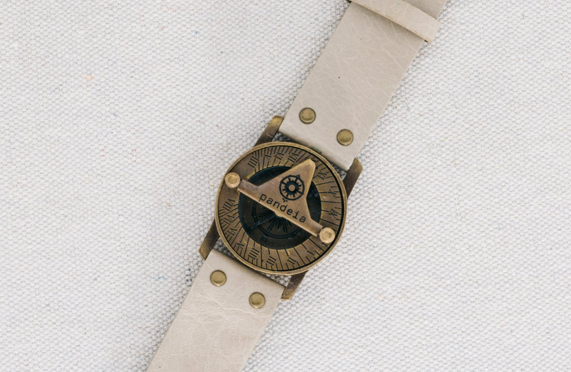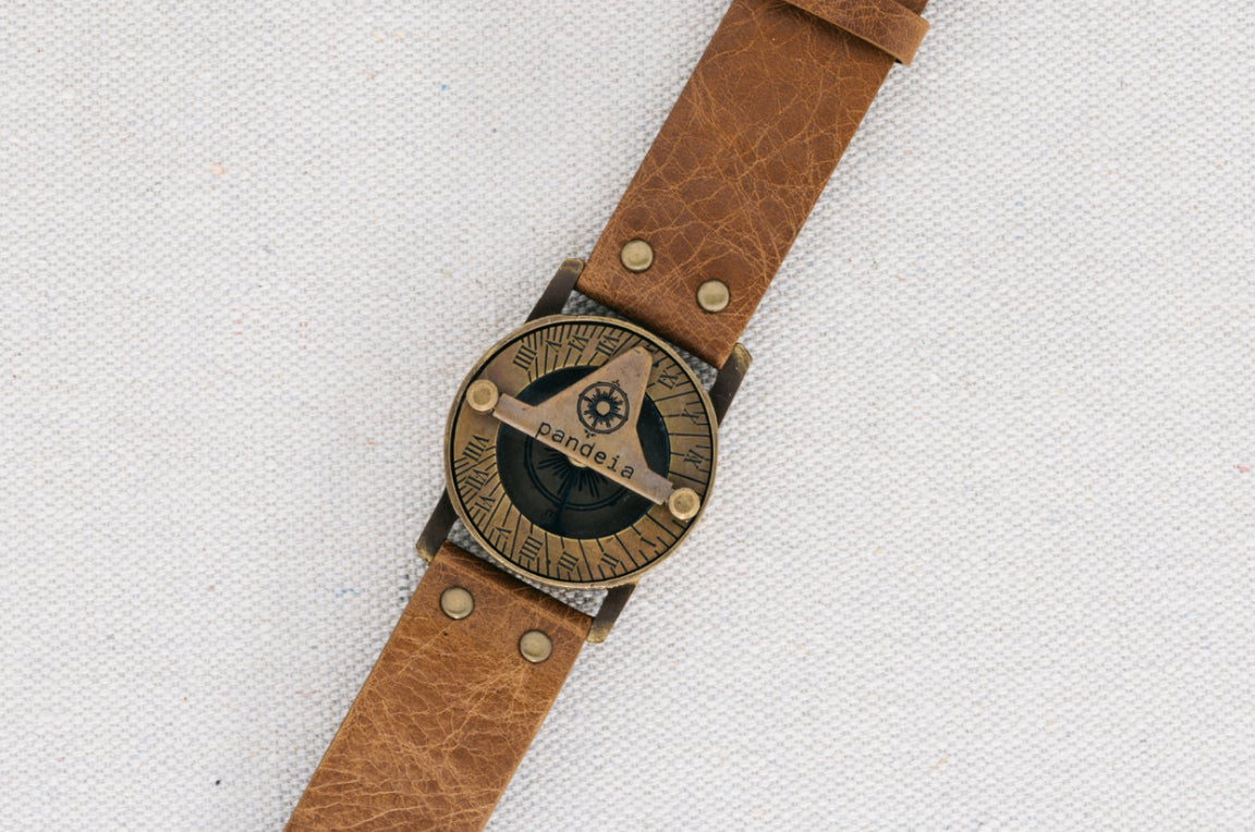 Pandeia compass sundial watches were created to adorn the wrists of the wild ones. This unique time piece uses the forces of nature surrounding us to tell the time. They were inspired by ancient methods of horology and are crafted to perfection on the island of Maui. Composed of antiqued brass, glass and leather, each watch is as unique as its curious owner. Every watch is individually numbered for authenticity, marked by a hand-stamped coin. Instructions for use are engraved on the back. Pandeia compass sundial watches serve as a wearable reminder to escape the boundaries of time and to always follow your inner compass.