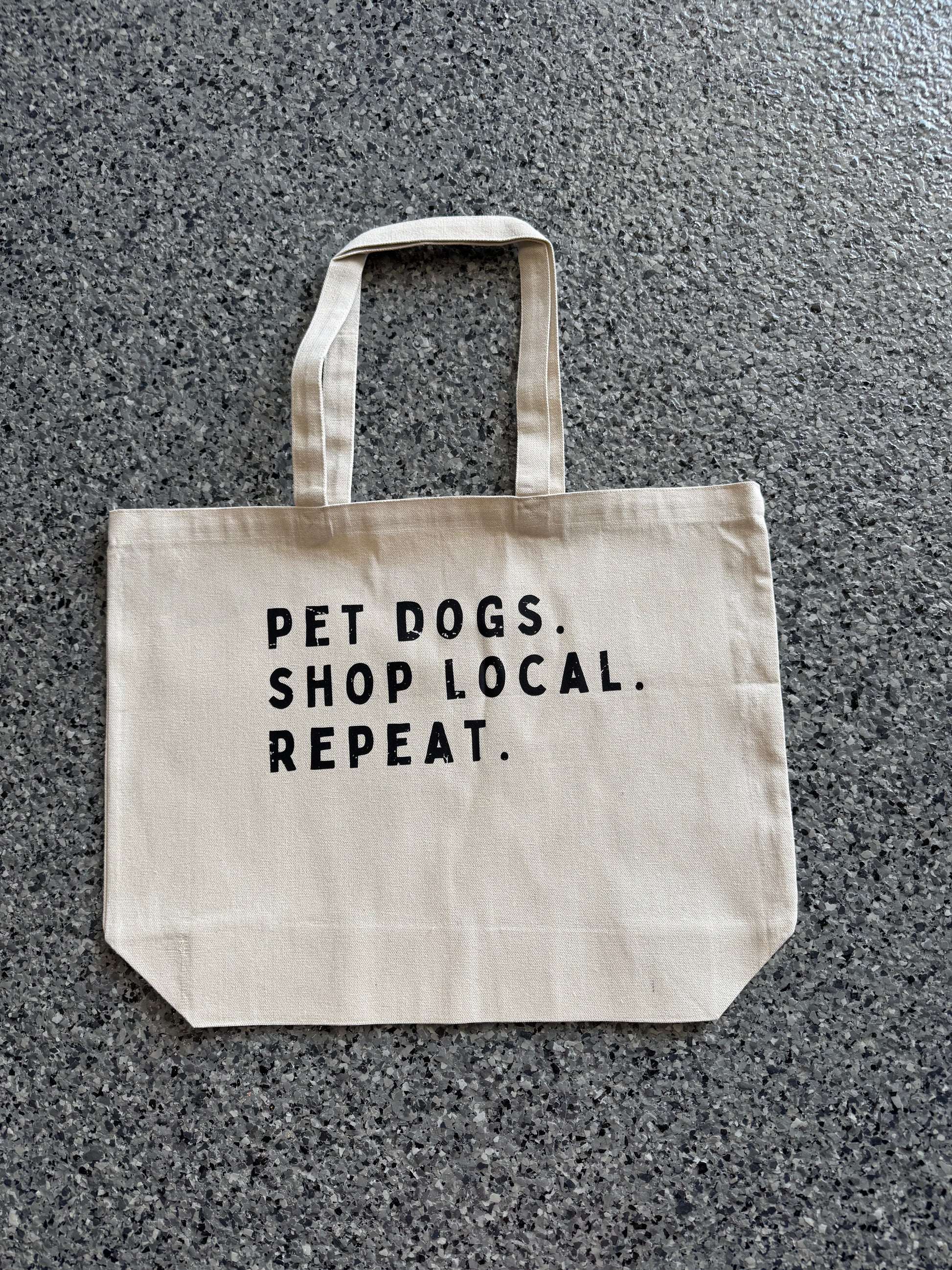 Carry your essentials with a playful nod to your favorite furry friends and local shops. This tote boldly declares "Pet Dogs. Shop Local. Repeat."—perfect for dog lovers who love supporting their community. Lightweight and roomy, it’s ideal for errands, walks, or just showing off your local pride with a wag and a smile.