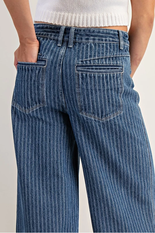 Slip into the ultimate statement piece with our Pinstripe Rolled Cuff Jeans. Featuring a vertical pinstripe pattern that elongates your legs, a structured waistband for a flattering fit, and exaggerated rolled cuffs for a bold and cropped look. With five pocket styling and a button and zip fly closure, these jeans are the perfect addition to your wardrobe.
