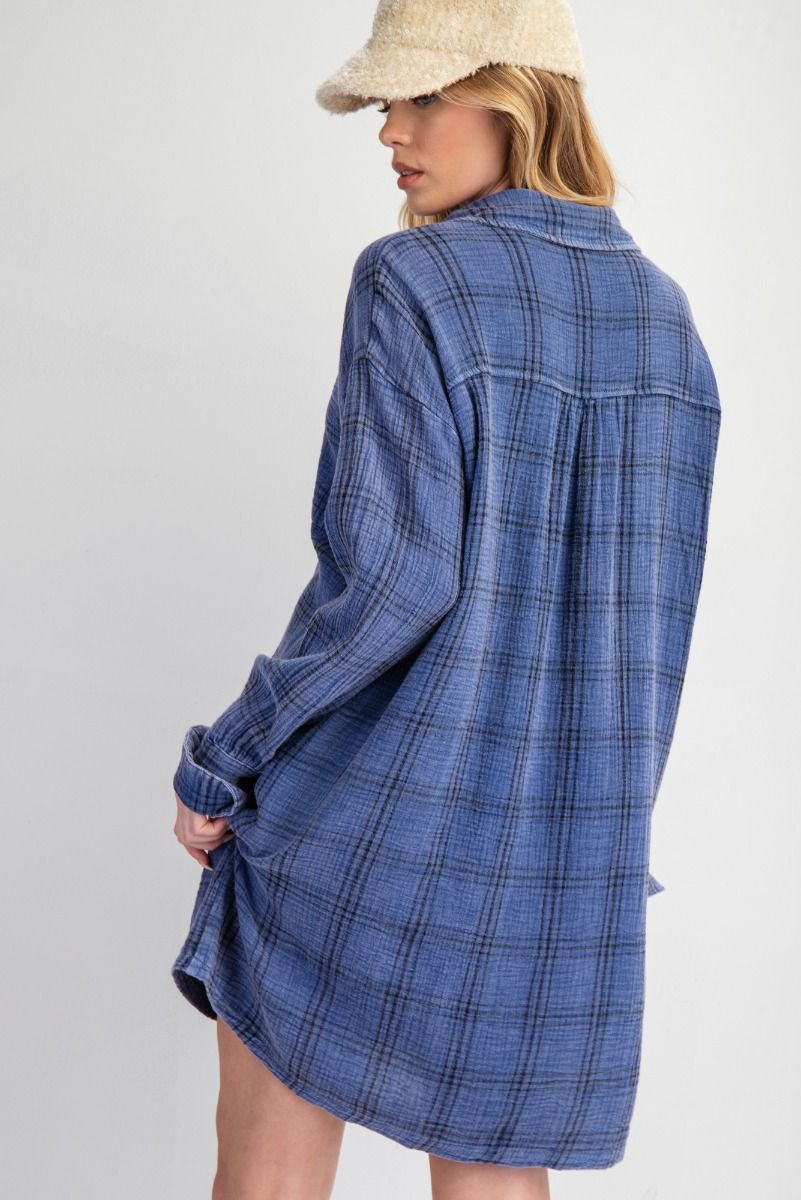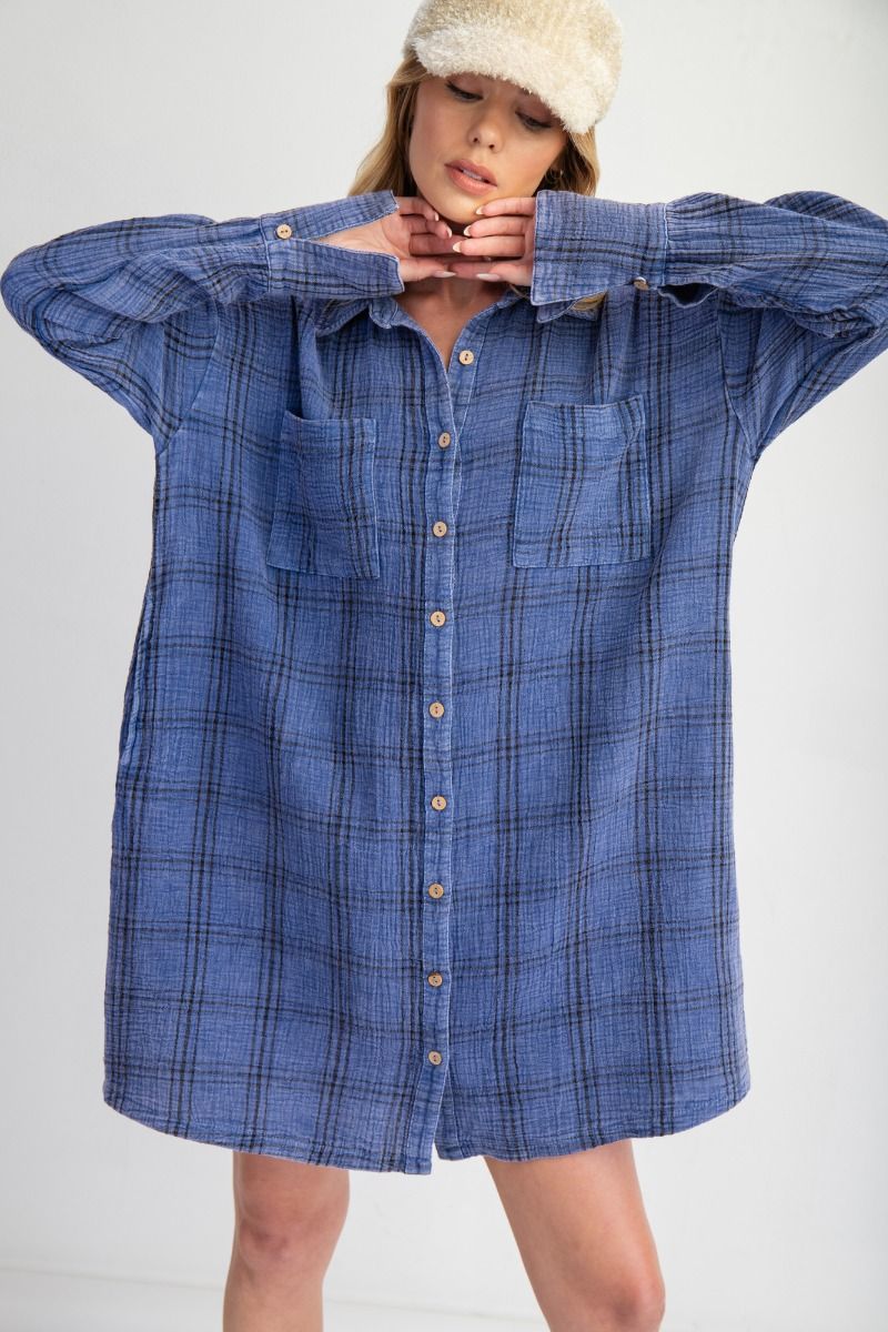 Embrace effortless style with this playful Plaid Shirt Dress featuring dropped shoulders and a collared neckline for a casual vibe. Front chest pockets and side pockets add charm and convenience, while the button-down closure and button cuffs let you adjust your look. Its relaxed, loose fit combined with a subtle cross-hatch texture makes it perfect for layering or wearing solo on sunny days.