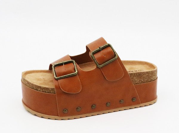 Elevate your style with our Platform Double buckle sandal. The soft cork sole in a rich cognac color provides comfort and the double buckle adds a touch of edginess. Made from vegan leather, these sandals are eco-friendly. Don't forget the added tack button detail, we're obsessed! (true to size, size up if in-between)