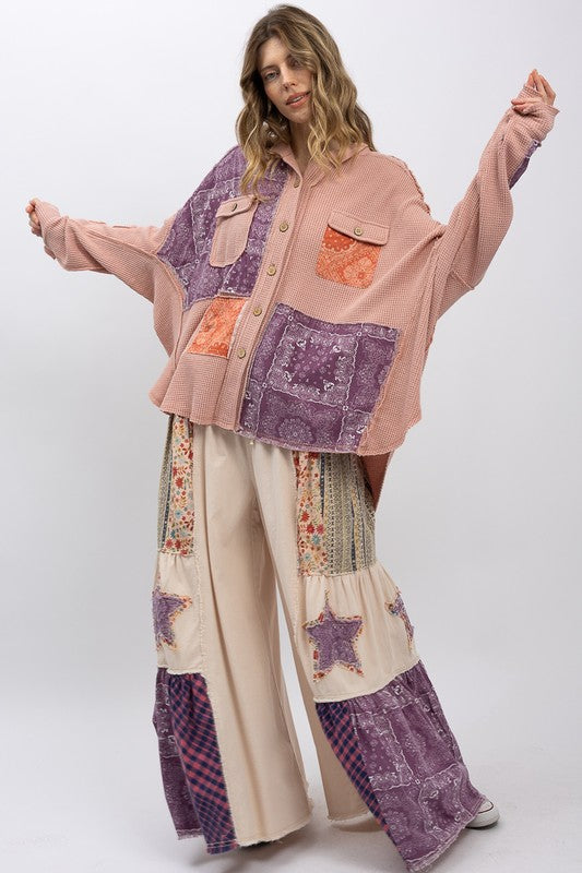 Effortless comfort meets playful style with these Ruffle Star Pants. Featuring an elastic waistband with drawstring for a customizable fit, they slip on easily for grab-and-go convenience. Practical side pockets keep essentials within reach, while mix print side panels and double-layered star patchwork details add visual interest and personality. Crafted from lightweight cotton twill, these pants move with you throughout your day without weighing you down. Perfect for anyone seeking versatile bottoms that don't compromise on flair.