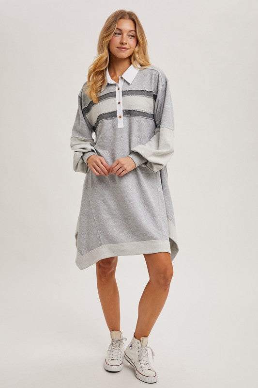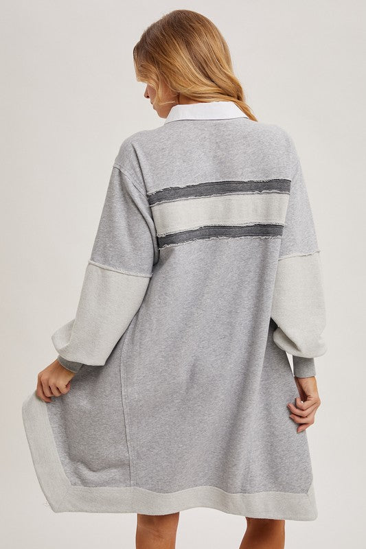 Embrace effortless style in the Slouchy Polo Dress, where laid-back comfort meets playful edge. Featuring a relaxed, oversized fit with raw-edge details, this dress keeps things cool and casual while the classic polo collar adds just the right touch of polish. Contrast stitching or fabric panels spice up the look with a fresh, modern twist. Perfect for a breezy day out, it’s easy to move in and even easier to love. Pair with sneakers or boots and step out with a charmingly carefree vibe!