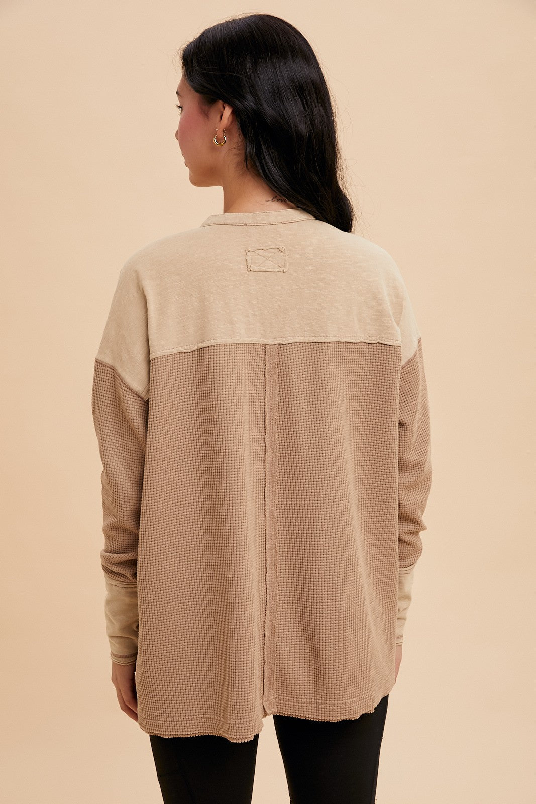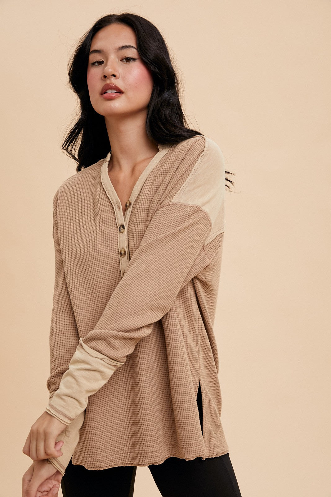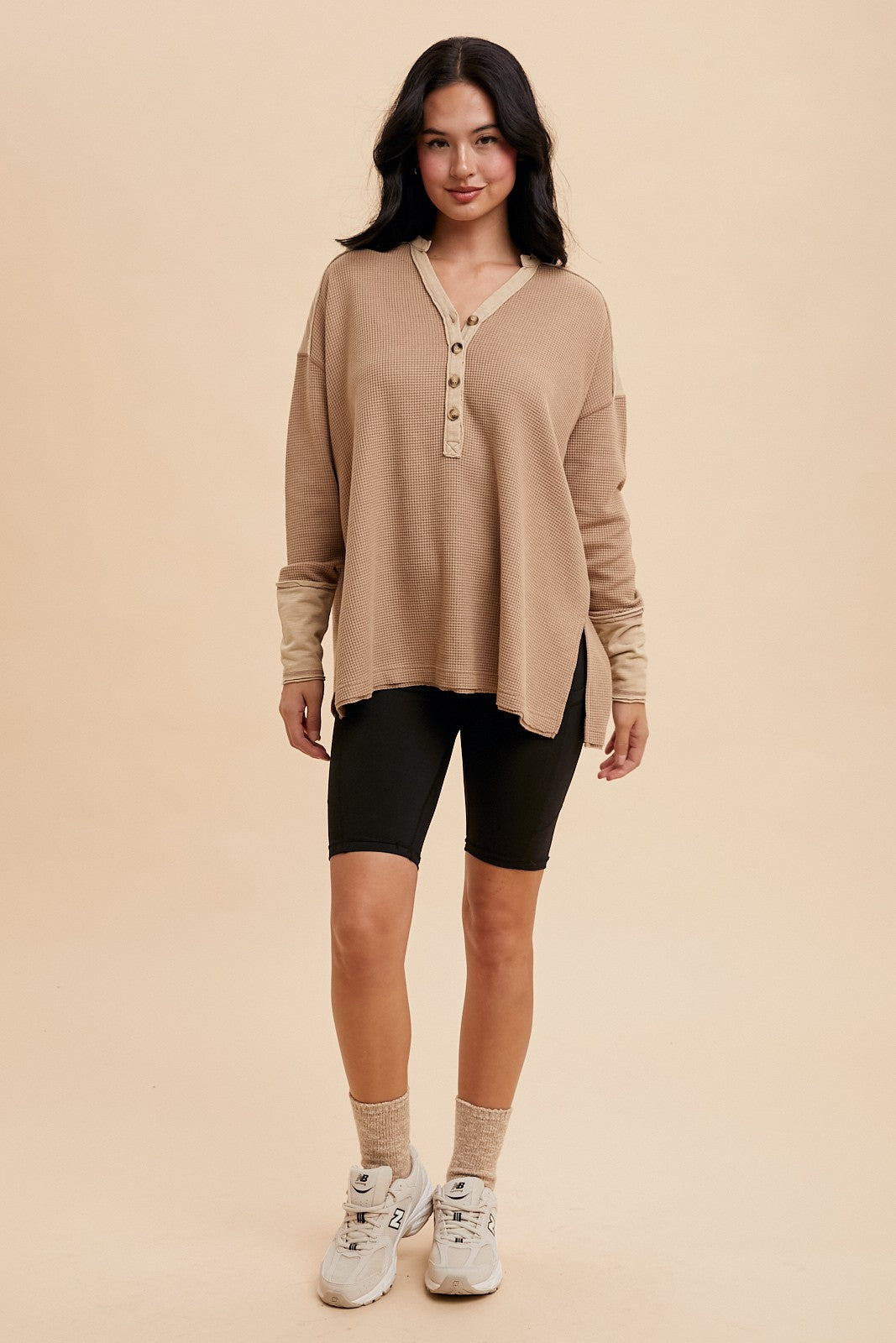 Cozy up in our Thermal Henley, crafted from heavyweight thermal fabric to keep you warm and comfy. Playful contrast slub knit accents add a fun twist, while tortoise shell buttons bring a stylish, functional touch. Finished with a garment wash, this top feels perfectly broken-in from day one. Perfect for layering or wearing solo on chilly days!