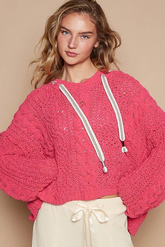 V-Neck Hooded Chenille Sweater - Fuchsia