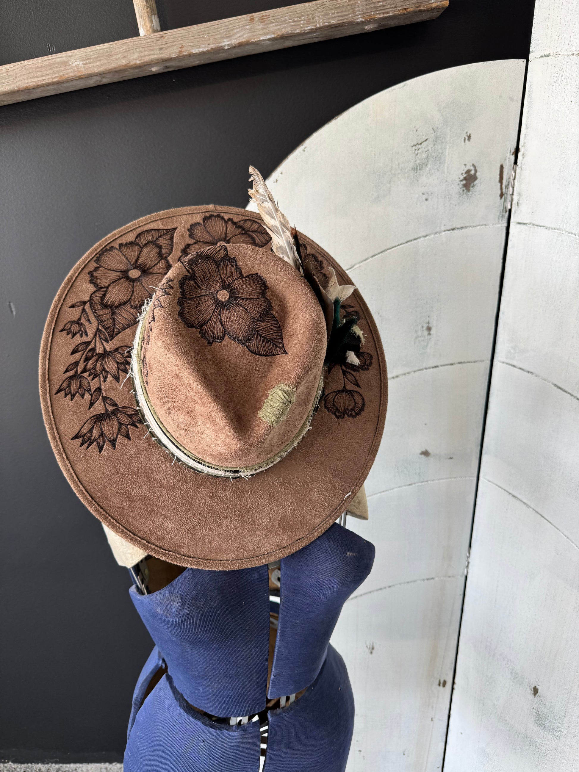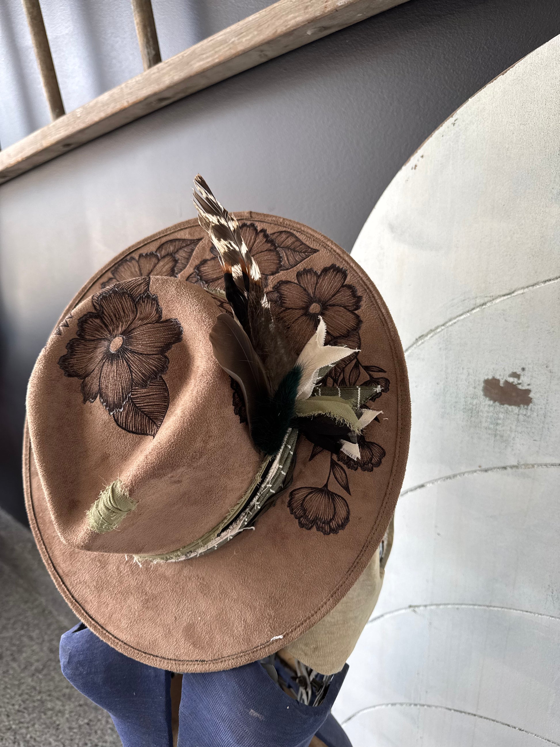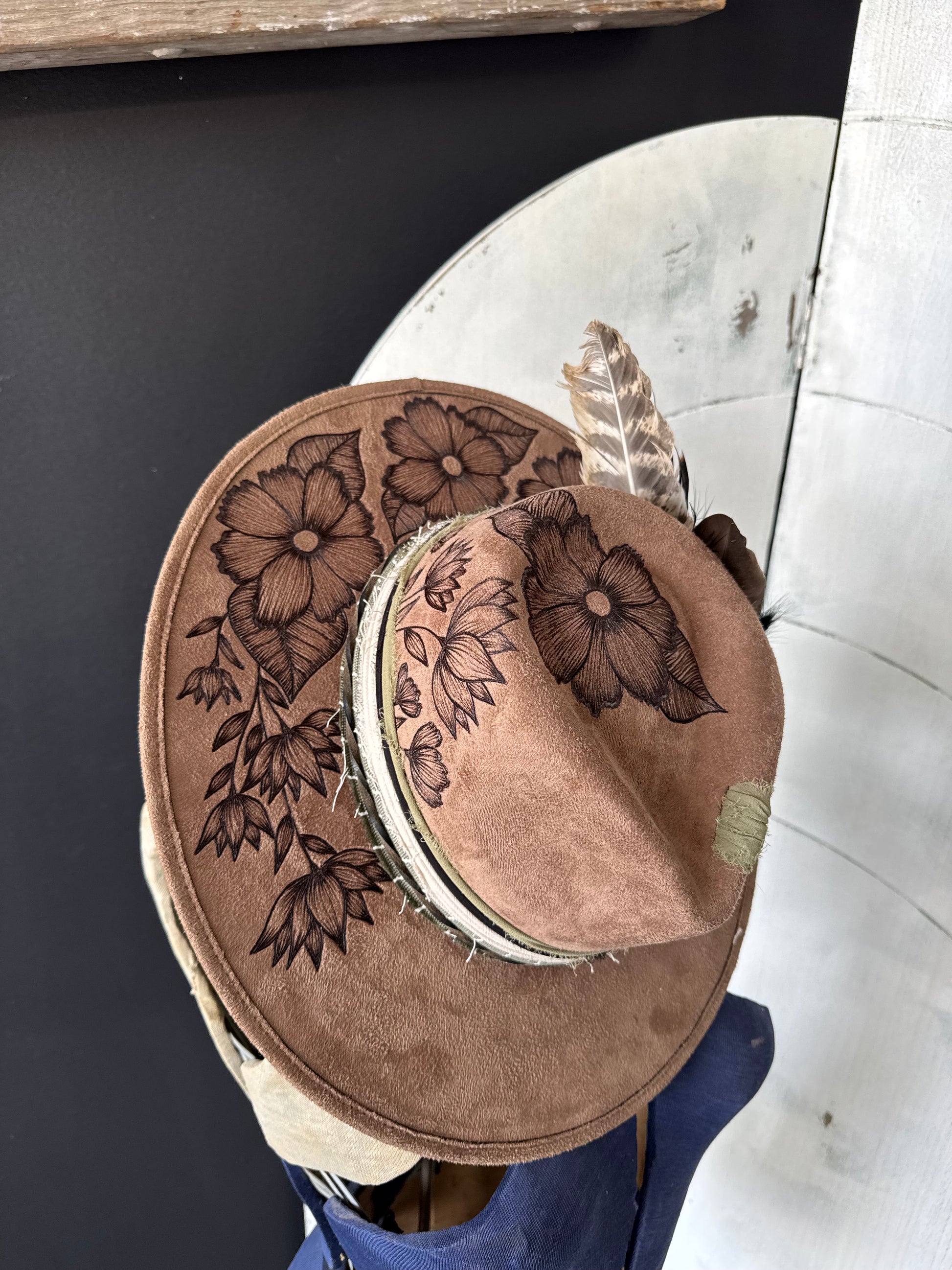 Stay shady and stylish with our Wildflower Design Burned Hat! Each wide brim hat is hand burned by the talented artists at Wildflower Design, making it a unique and eye-catching accessory. Keep the sun off your face while standing out from the crowd.